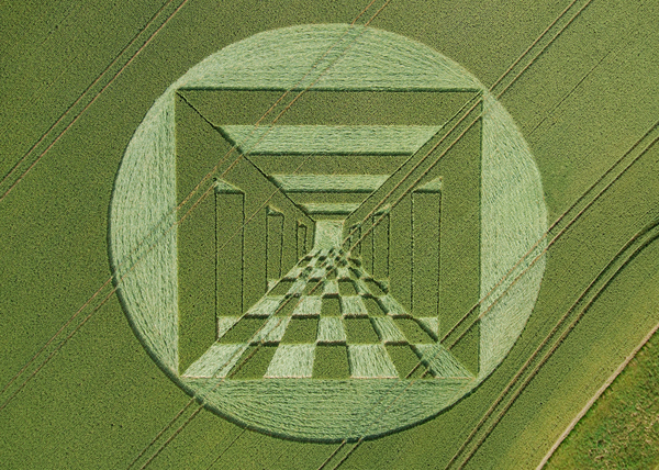 웨스트 케넷에서 발견된 이 크롭서클은 긴 복도를 표현했으며 복도의 끝이 소실점이 되는 1점투시 원근법을 사용했습니다. 좌 우로 세 개씩 문이 배열되어 있고 바라보는 사람과의 거리가 늘어남에 따라 그 크기가 줄어듭니다. 바닥은 체크무늬 타일로, 천장은 들보로 이뤄졌는데, 그 크기와 방향에 원근법이 적용되어 있습니다.
