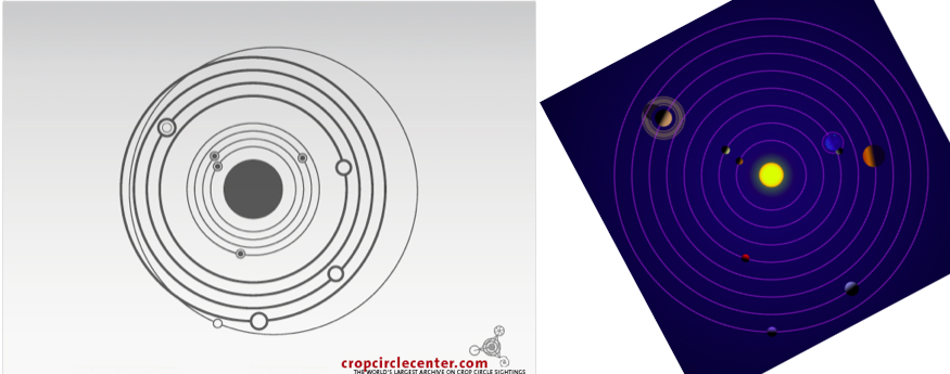 크롭서클 이미지 (출처: cropcirclecenter) 와 2012년 12월 21일의 태양계 행성 분포 (출처: The planets today)